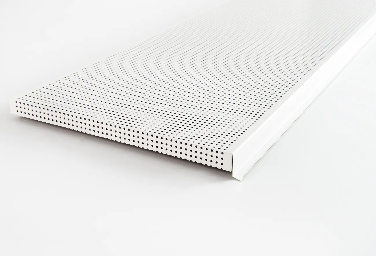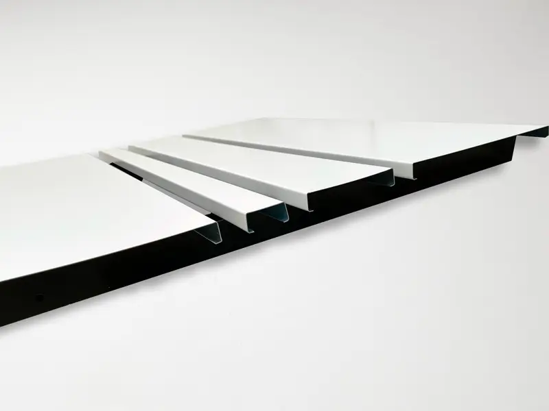 Falso techo lineal formado por lamas fabricadas en aluminio combinables.